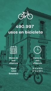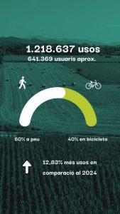 En cuanto a la bicicleta, en 2025 se han contabilizado 490.997 usos, con una marcada estacionalidad, ya que los valores más altos se registran durante los meses de verano. El Carrilet II Nord se consolida como el principal eje ciclista de la red, seguido de itinerarios como el Tren Petit y la Ruta del Ferro i del Carbó, especialmente vinculados al ocio y al turismo. Los datos muestran un ligero descenso, del 43 % de los registros en 2024 al 40 % en 2025.