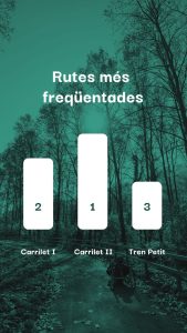 En cuanto a las rutas, destacan la Ruta del Carrilet I Nord y la Ruta del Tren Petit, que concentran gran parte de los usos totales, aunque presentan perfiles diferentes: la primera con un claro predominio de peatones y la segunda con un uso muy equilibrado entre los desplazamientos a pie y en bicicleta.