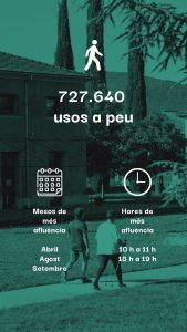 Este año, el número de usos registrados ha experimentado un crecimiento notable, con un aumento del 12,8 % de los registros. La distribución de los usos se reparte entre el 60 % de desplazamientos a pie y el 40 % en bicicleta.