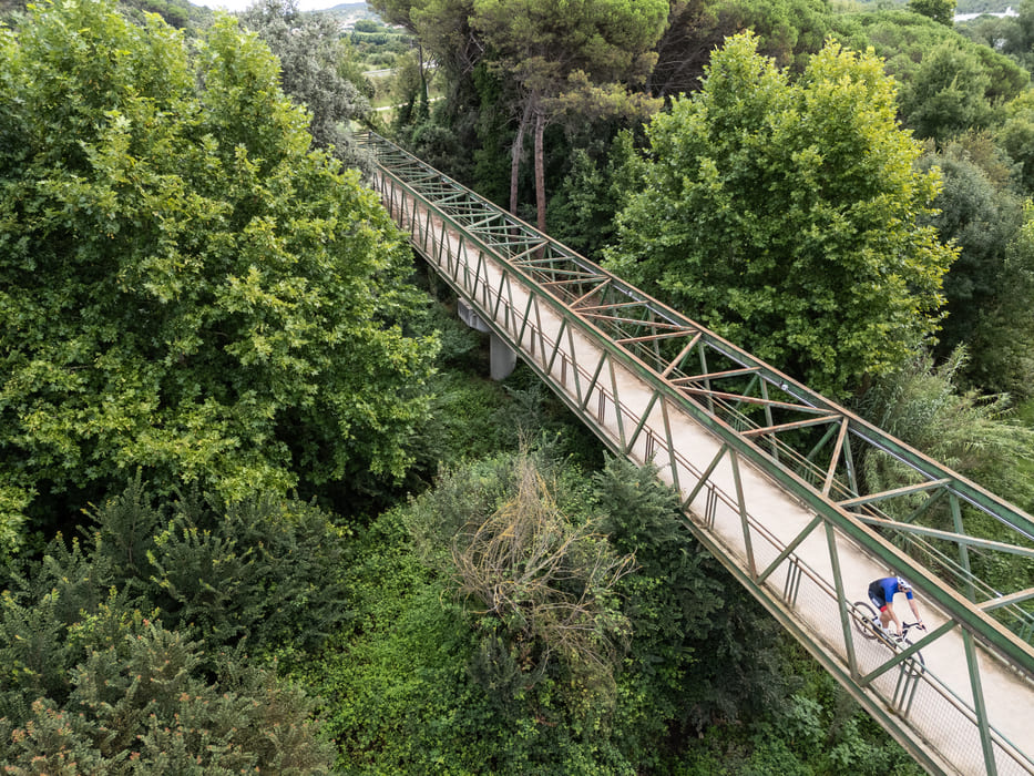 Després del pont ve una rampa de baixada d’uns 120m. Si vas amb una handbike de Vies Verdes, és important frenar suaument des del principi i no deixar embalar la handbike.